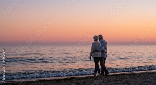 A tender moment of an older couple strolling by the ocean, with soft waves and a glowing orange-pink sunset in the background. The image conveys love, longevity, and peace.