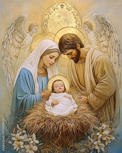 A tender Nativity scene painting of Mary and Joseph gazing lovingly at Baby Jesus in a manger, adorned with golden halos, surrounded by angels and soft floral details in a serene, holy atmosphe