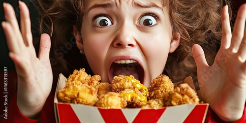 chicken, nugget, fried, food, meal, delicious, crispy, tasty, eating, appetence, hunger, munchy, craving, fast food, junk food, snack, dinner, lunch, girl, woman, scared, fear, shocked, surprise, amazement, panicked, frightened, astonished, excited, happy, joyful, mouth, open, hand, expression, face, box, mustard, sauce