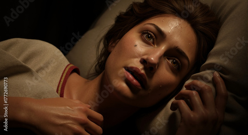 woman, fear, nightmare, anxiety, panicked, distress, perspiring, scared, bed, night, closeup, face, dream, cinematic, drama, emotion, stress, insomnia, disease, fever, suffering, vulnerable, portrait, person, eye, worried, troubled, intense, chiaroscuro, lighting, shadow, pillow, bedchamber, sleep, awake, terror, panic, mental health, anguish, despair, crucified, historical, ancient, roman, lady, actress, biblical, lying down, dark