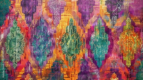 A textured background featuring a woven ikat fabric in vibrant, multicolored patterns