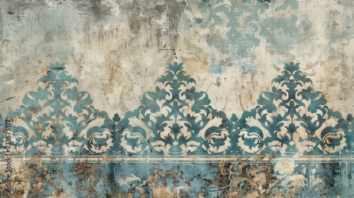 A textured damask print border with a weathered look and faded hues of blue and green