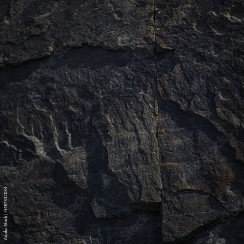 A textured stone background with chiaroscuro lighting, showcasing a brutal, monolithic rock formation. Cracks and fragments highlight its geological power, perfect for design templates or science