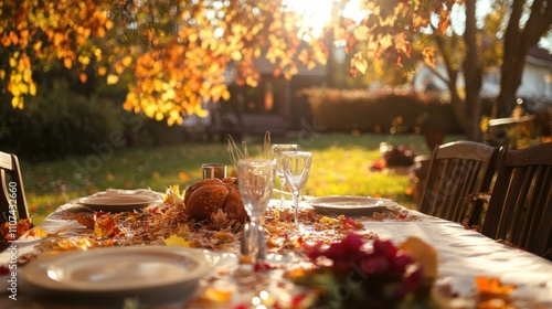 A Thanksgiving table set outdoors on a crisp autumn day, with colorful leaves on the ground and warm lighting,