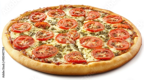 A thin-crust pizza with pesto sauce, fresh tomatoes, and mozzarella.