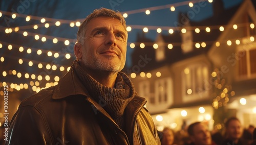 man, middle-aged, winter, festival, light, smiling, happy, joyful, neighbourhood, evening, celebration, gathering, friends, community, bokeh, atmosphere, casual attire, warmth, holiday, social, cheerful, local, event, relaxation, contemplative, vibrant, enjoyment, seasonal, brilliant, twinkling, candid, festive, scenery, ambience, night, reflective, cultural, entertainment, connection, family, charme, togetherness
