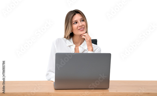 laptop, desk, thoughtful, isolated, white, background, woman, transparent, layout, template, cut, design, closeup, collage, clean, contemplation, workplace, business, professional, computer, technology, cyberspace, office, corporate, online, employee, light, sitting, working, wood, material, blond, female, casual attire, shirt, thinking, pondering, planning, strategy, research, looking, up, executive, manager, men at work, education, concept