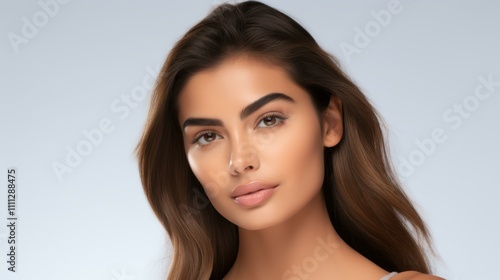 A thoughtful young woman gazes left, her beauty shining against the pure white background, lost in contemplation.