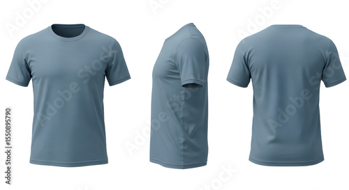 A three-dimensional view of a plain blue t-shirt displayed from multiple angles, emphasizing its texture and fit for potential apparel use