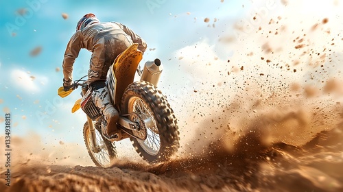 A thrilling desert motocross rally scene featuring a powerful bike hurtling through loose sand dunes leaving a storm of dust in its wake The dynamic rear view captures the energy of the race