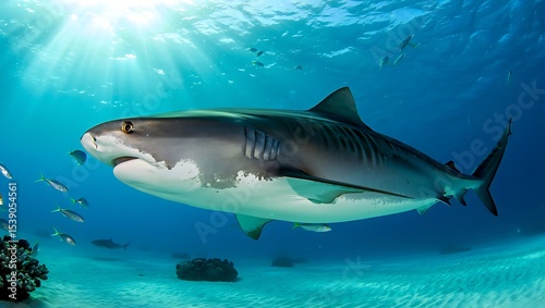 A tiger shark swimming in the ocean with fish and coral reefs in the background and sunlight above
