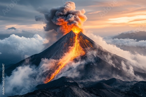 A time-lapse view of a volcano erupting, with ash clouds spreading across the sky and lava glowing in the night