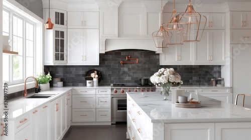 a timeless traditional kitchen featuring white cabinetry and charcoal gray backsplashes, creating a modern yet classic aesthetic