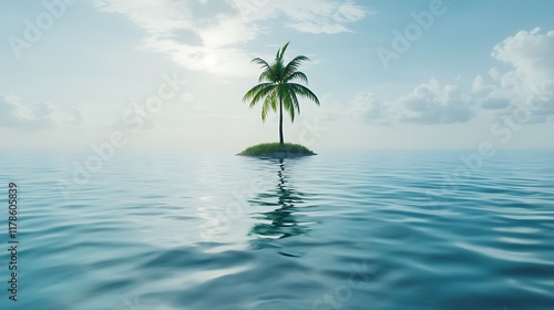 A tiny island in the middle of a calm ocean with a single palm tree and soft ripples