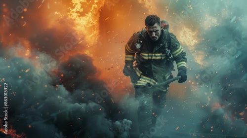 A tired firefighter, with his firefighter uniform, black pants with refractory, on a firefighting mission, smoke is seen behind