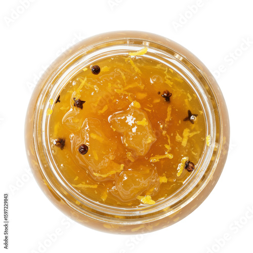 A top view of a jar filled with homemade citrus jelly, featuring spices and zest, ideal for culinary use