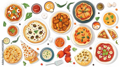 A top view of a set of Desi, Indian traditional foods, including pizza, hummus, biryani, chicken curry, momos, tikka, korma, and samosas. This food collection set is isolated on a white background.