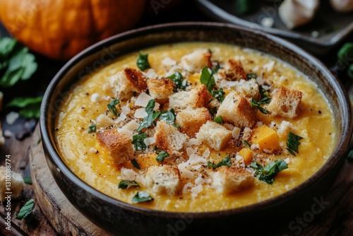 ai, wooden, spoon, cream, soup, crouton, pumpkin, food, autumn, vegetarian, vegan, thanksgiving, rustic, parsley, homemade, healthy, hot, dinner, background, cutting, cooking, board, copy space, nourishment, seed, kitchen, vegetable, video, view, lay, top, garlic, linen, lunch, topview, concept, dish, meal, green, served, sliced, clothes, toast, flat, napkin
