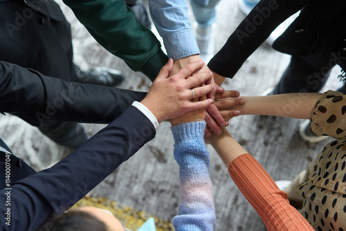 A top view of business people joining hands in a circle, symbolizing unity, collaboration, and shared success in the workplace