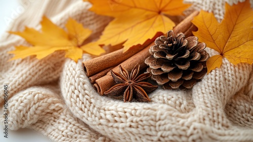 A top view photo of cinnamon sticks, yellow maple leaves, anise, and a pine cone nestled on a beige scarf on an isolated white background with copyspace, evoking an autumn mood