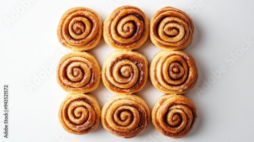 A top-down view of a batch of freshly baked cinnamon rolls, perfectly golden and swirled with cinnamon, isolated against a clean white background, emphasizing their rich texture and icing