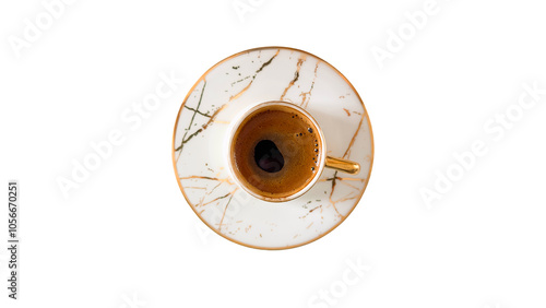 A top-down view of a cup of coffee placed on a decorative marbled saucer, isolated on a white background.