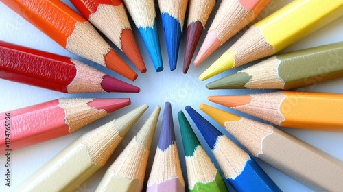 A top-down view of a variety of colored pencils arranged in a creative pattern on a clean white surface with space for text.