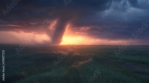 A tornado forming over a prairie at dawn, with the first light of day barely breaking through the storm clouds