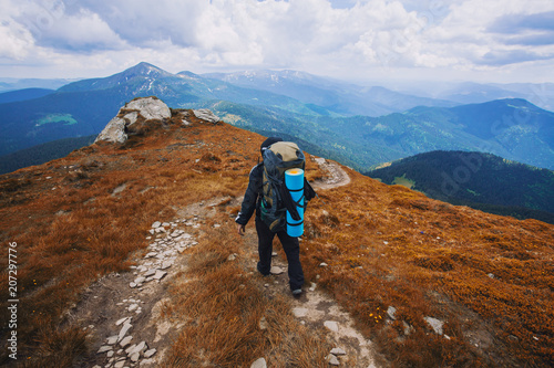 activity, adventure, backpack, freedom, happy, hike, hiking, landscape, leisure, man, mountain, travel, hiker, summer, backpacking, trek, holiday maker, journey, peak