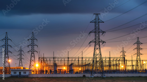 A towering network of high-voltage power lines with crackling metallic textures stretches across a stormy dusk sky