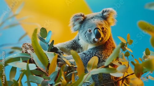 A toy zoo with a koala and eucalyptus tree on a blue and yellow background