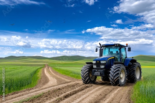 A tractor plowing rich, dark soil in a vast farmland, with birds flying overhead and distant hills on the horizon