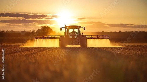 A tractor spraying crops at sunset in the farmland