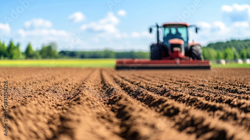 A tractor with a grain seeder sows grain on a plowed field, earth with furrows, blue sky, agricultural machinery, sowing, spring, agriculture, farm, wheat field, barley, ploughing a field