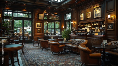 A traditional coffee house with dark wood tables, overstuffed armchairs, and soft ambient lighting. The cozy, inviting space is perfect for quiet conversations and relaxation --ar 16:9 --no logo