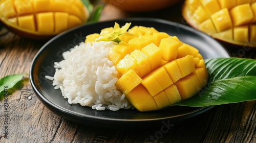 A traditional dessert of yellow mango with sticky rice and coconut milk, presented on a black plate with a mango leaf on a wooden table.