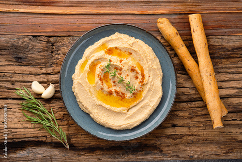 A traditional dish or appetizer hummus or baba ghanoush on wooden background