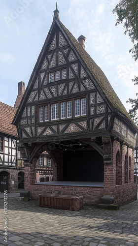 building, old, architecture, historical, timbered, half, facades, stage, performance, traditional, historic, mediaeval, wooden, brick, stone, town, village, city, german, europa, courtyard, square, exterior, rural, structure, landmark, culture, heritage, travel, tour tourism, art, design, house, home, street, paving, wall, roof, window, door, beam, wood, moss, grass, tree, sky