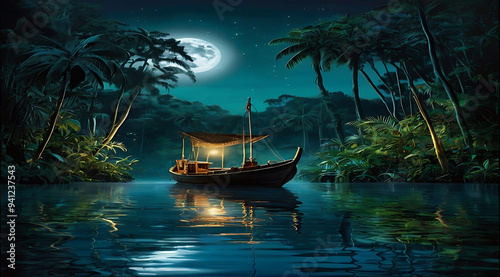 A traditional houseboat is moored on the banks of a fishing lake in Kerala's Backwaters.