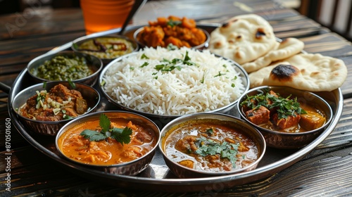 A traditional Indian thali with a variety of dishes including curry, rice, naan and chutney, beautifully arranged on a metal platter on plates.