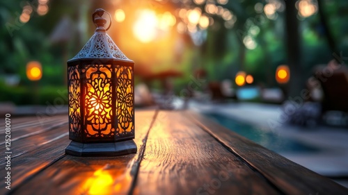 A traditional lantern on a wooden table. Generative AI