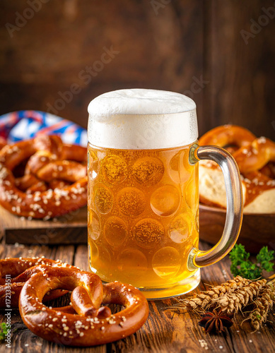 oktoberfest, stein, foam, wooden, table, pretzel, traditional, beer, festival, rustic, food, cultural, celebration, vibrant, drink, festive, autumn, heritage, decoration, glassware, authentic, frothy, refreshment, wood, cheerful, beverage, homemade, snack, hearty, iconic, mug, crafted, plating, event, scene