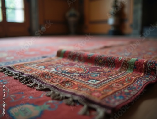 A traditional prayer rug with detailed patterns, rich colors, and soft texture, neatly folded in a calm indoor setting