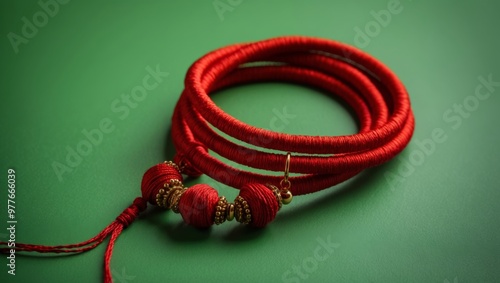fashion, circular, up, accessory, jewellery, craftsmanship, elegant, style, artisan, handcraft, decorative, artistic, ornamental, vibrant, bead, gold, festive, adornment, close, detail, bracelet, craft, traditional, cultural, ethnic, ceremonial, textile, red, green background, patterned, thread, coiled, wrapping, multilayer