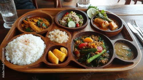 A traditional Thai meal served on a wooden tray, with several compartments filled with rice, curry, vegetables, and fried dishes, beautifully arranged for a family feast.