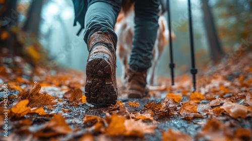 a trail covered in leaves and dirt, with a hiking backpack and trekking poles visible, capturing the practical side of hiking with pets.