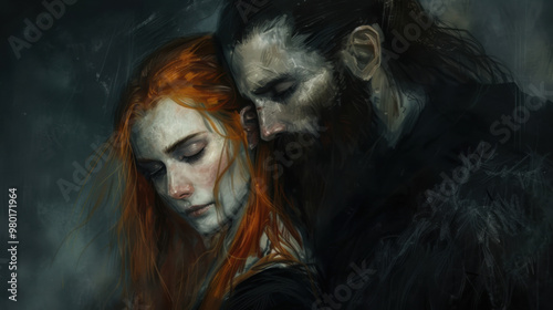 A tranquil couple, she with wavy light orange hair in black, he with a dark beard, both dressed in black, share a thoughtful gaze. Their expressions and visible brushwork create a peaceful scene.