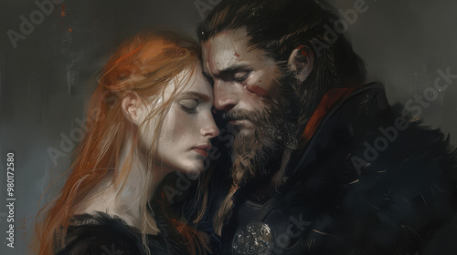 A tranquil couple, she with wavy light orange hair in black, he with a dark beard, both dressed in black, share a thoughtful gaze. Their expressions and visible brushwork create a peaceful scene.