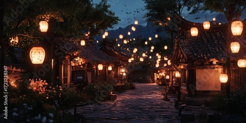 A tranquil evening street scene featuring illuminated lanterns hanging above a traditional village path. The charming ambiance captures serene moments in nature.