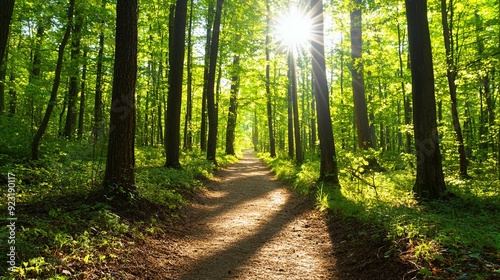 A tranquil forest path illuminated by sunlight, surrounded by lush greenery and tall trees, inviting nature lovers to explore.